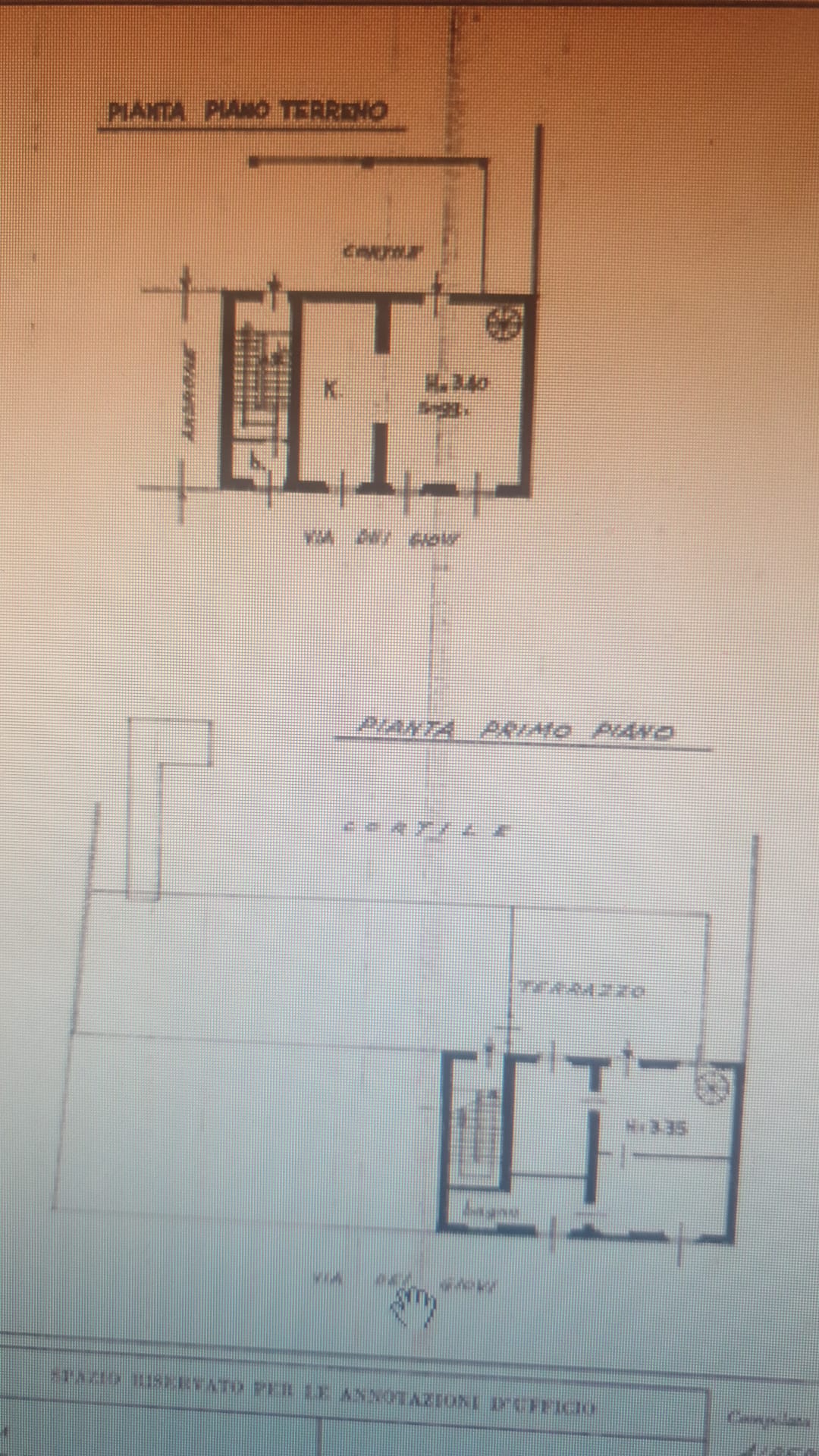 Il primo appartamento di 6,5 vani è di circa 135 mq e si sviluppa su due livelli, collegato sia esternamente che anche internamente da scala a chiocciola. Al piano terra si trova la zona giorno con salone e cucina separata abitabile, al primo piano la zona notte con tre camere e bagno. Il secondo appartamento è di 4 vani, si trova direttamente al primo piano e ha una superficie di circa 95 mq con soggiorno, cucina e altre due camere e bagno. Entrambi gli immobili hanno una scala interna in comune, oltre ad una scala esterna dal cortile al quale si può accedere all'ampia terrazza di oltre 100 mq. Dal cortile interno si può accedere ai 2 magazzini categoria C/2 di circa 120 mq ciascuno e al laboratorio Cat. C/3 di circa 270 mq. Sottotetto eventualmente recuperabile.